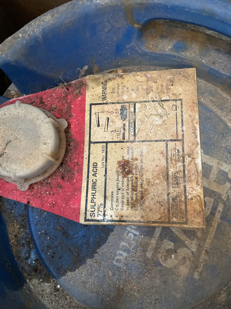 | Sulphuric acid 77% | 50 litres | Garage 7 | | 2025-01-11 | https://wordpress.peter.freemyip.com/wp-content/uploads/2025/01/image-46-768x1024.jpg |