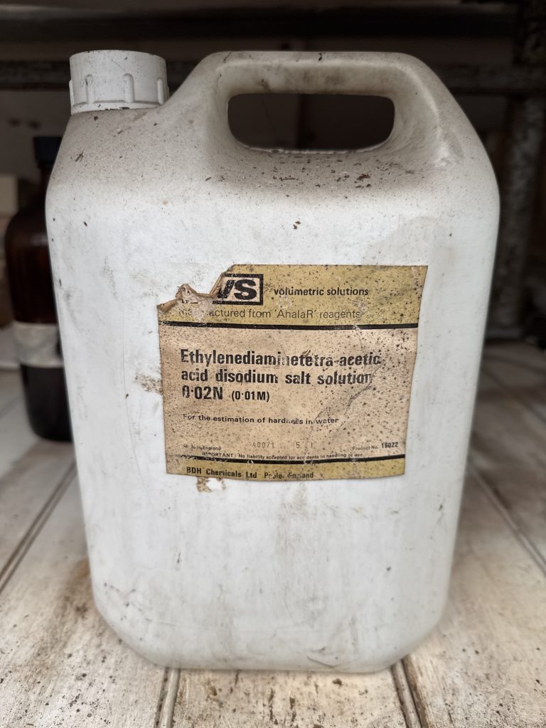 | Ethylenediaminetetra-acetic acid disosium salt solution | 5 litres | 9 | | 2025-02-15 | https://wordpress.peter.freemyip.com/wp-content/uploads/2025/02/image-2-768x1024.jpg |