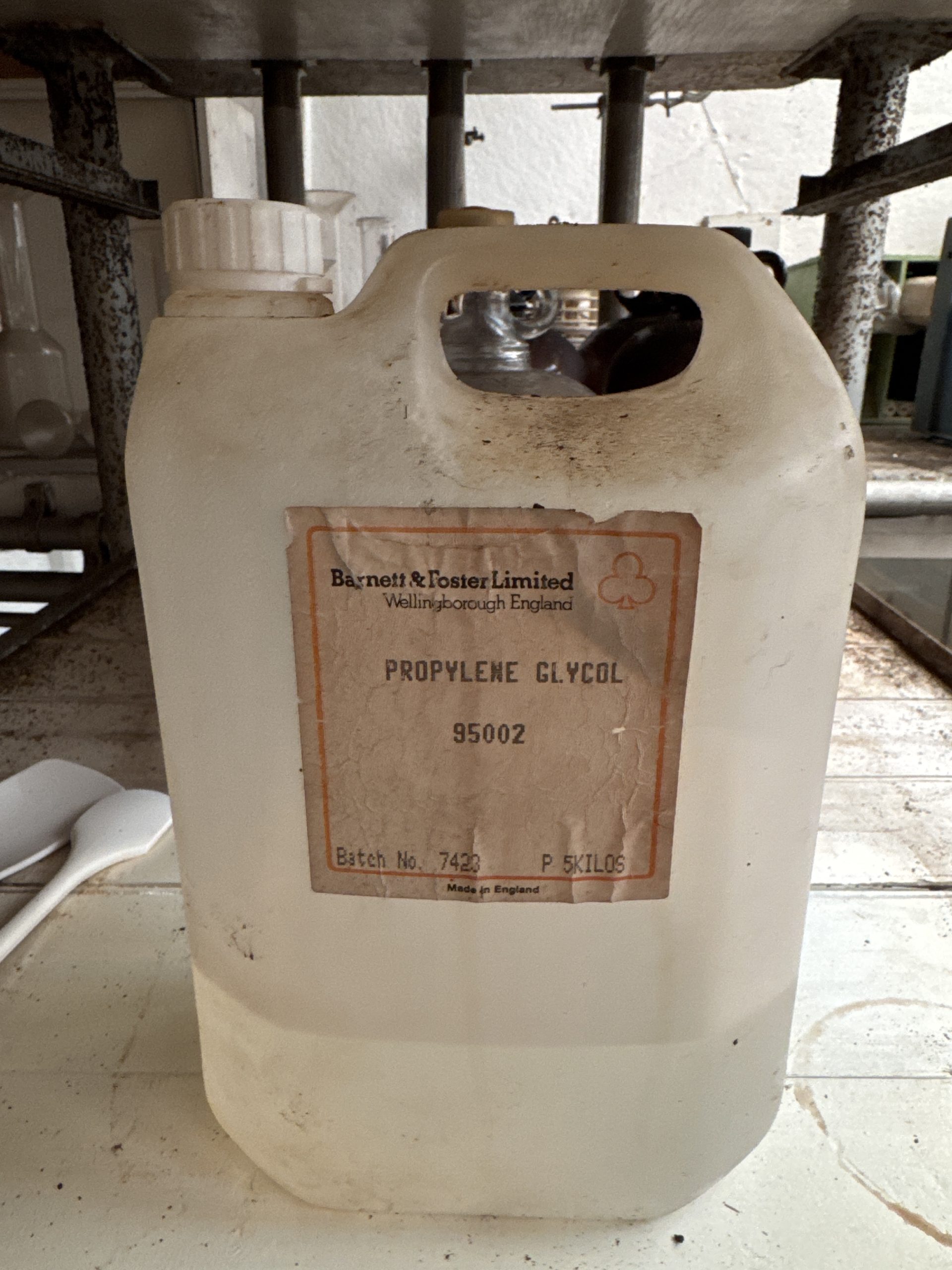 | Propylene glycol | 1 litre | Shelf | | 2025-02-15 | https://wordpress.peter.freemyip.com/wp-content/uploads/2025/02/image-7-768x1024.jpg |